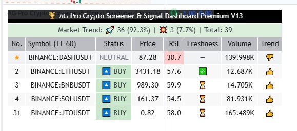 - Robustness: Built for Extreme Conditions. What happens when a coin is brand new and has no 50-bar EMA history? Most screeners fail. The AG Pro dashboard is "bulletproof." We have integrated robust na checks on all barssince calculations. This means new or incomplete data will never break your dashboard; they are simply and safely handled.
